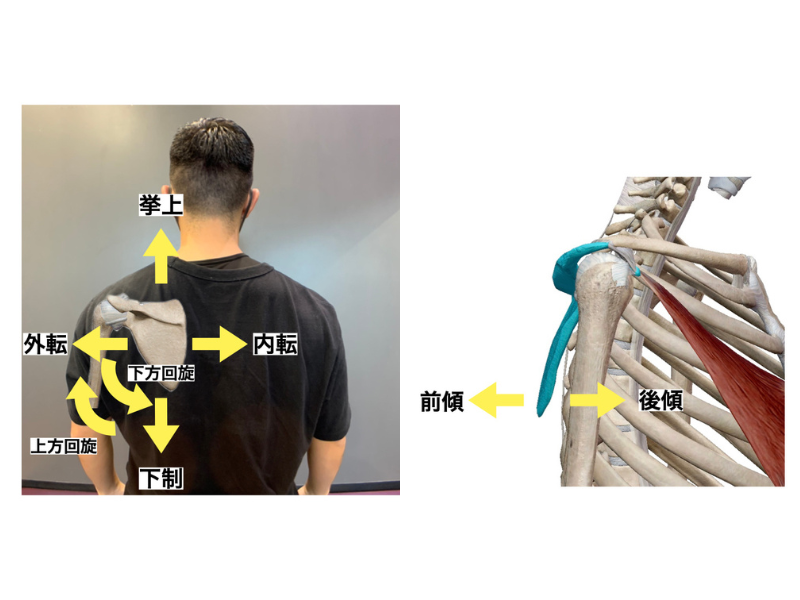 次は肩甲骨についてみていきましょう。3つの原因はそれぞれが複合して起こっており、同じ筋肉や関節に原因があることが多いです。肩甲骨の外転は肩甲骨が外に開いてしまっている、前傾は前に傾いている状態。日常生活ではデスクワークや、スマホの操作など基本的に身体の前での動作が多いので、特に利き腕側の肩甲骨は過度に外転や前傾を引き起こしてしまいがちです。