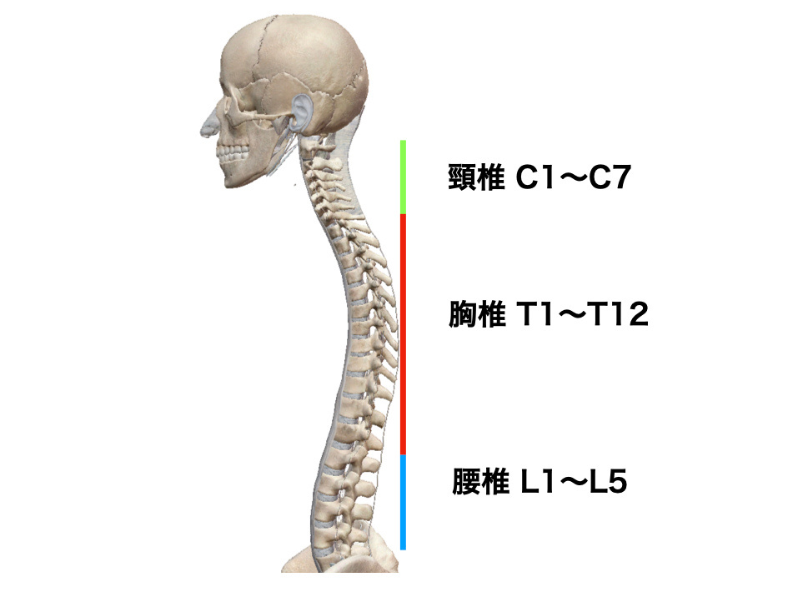 背骨は下の画像のように頸椎と胸椎、腰椎があり、これらは生理的湾曲といってS字状になっており、胸椎が後弯しているのは元々正常な状態です。ただ胸椎か過度に後弯したり、可動性を失っていることが問題となってきます。伸展といって反らす動きもですが回旋の動きも重要で、この動作が出ないと隣の関節の肩や首、腰への負担がかかってしまうのです。先に説明した2つの関節の原因の部分にも出てきた胸椎はマストで改善したい関節となります。