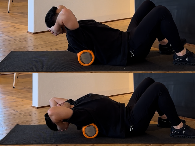 画像のようなフォームローラーがない方はタオルを丸めて行ってみましょう。フォームローラーをみぞおちの裏側あたりに当て、後ろに反らしていきます。腰が反りすぎないように注意しながら、みぞおちより上を伸ばしていくイメージで行います。