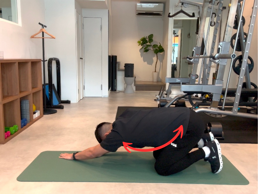 四つん這いの姿勢を作り右手の先に左手を置きます。その状態でお尻をかかとにつけるように引いていき広背筋をストレッチしていきましょう。左側の脇と骨盤の距離を離すように意識するとストレッチ感が増します。